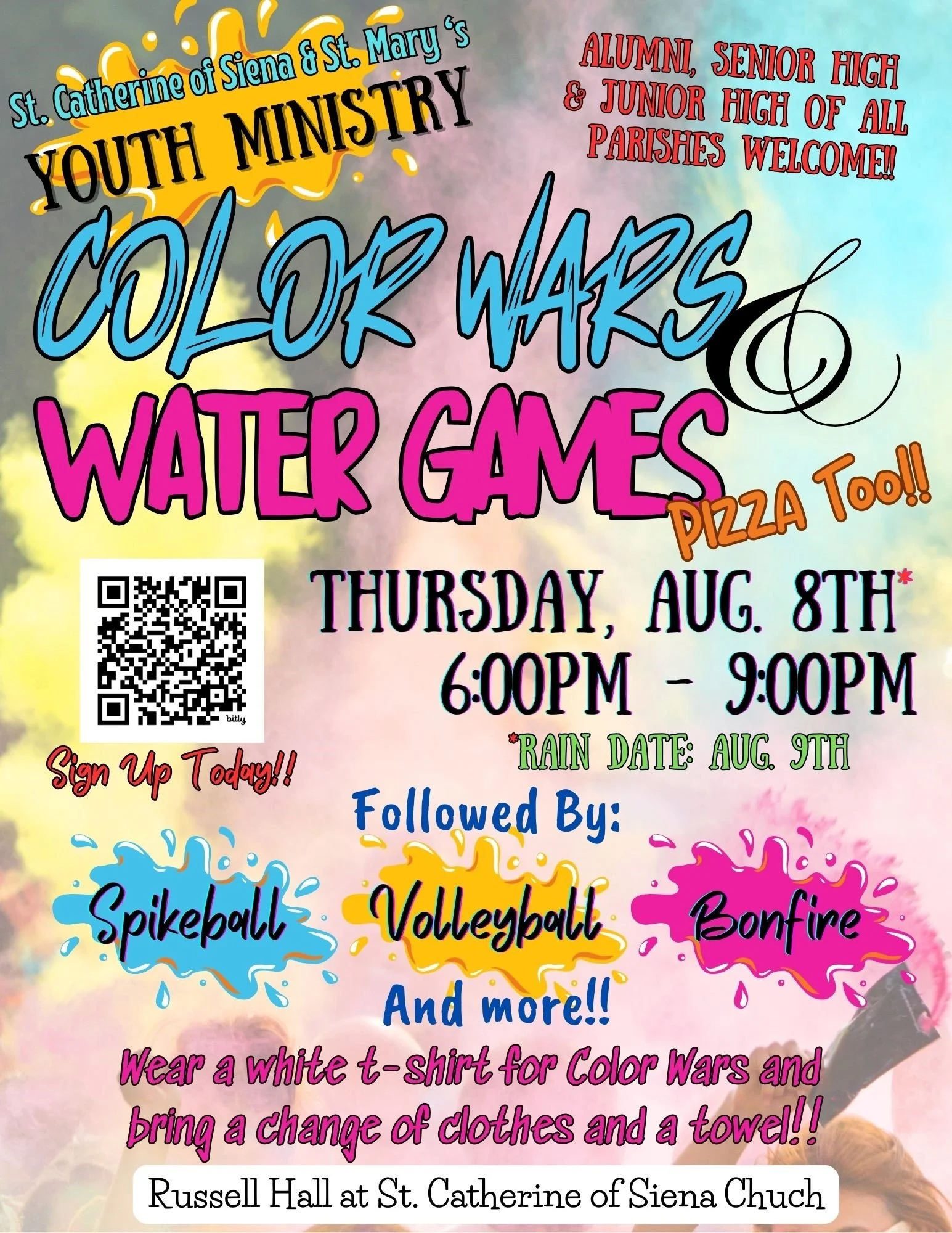 Thursday, August 8th — Water Games and Color Wars from 6-9 pm at St. Catherine of Siena. Pizza will be served. Wear a white t-shirt for color wars and bring a towel and change of clothes too. Register Here